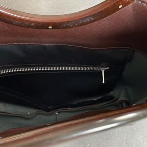 In good vintage condition except there’s cracks near one side of the handle. Very cute and minimalist style. No brand or tag look like vegan leather but not cheap. No lining inside just a zipper metal pocket. Measure approximately: 11,5’’ wide x 8’’ height. Sold as it.