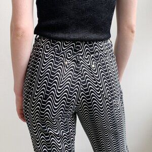 1990s versace high waisted trippy print with classic 5 pockets and straight fit through the leg. all the hardware is silver with the medusa head logo stamp. made in italy. size 27. 100% cotton. no flaws, perfect condition. waistband is 13", hip 19", rise 11.5", inseam 31"