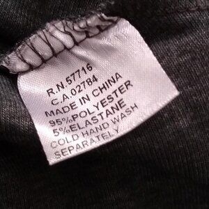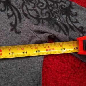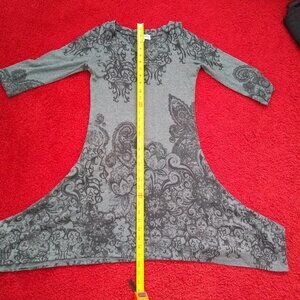 grey knit 3/4 sleeve tunic/dress with black floral brocade boho patterning