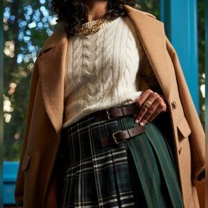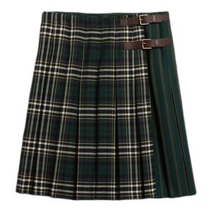 Crafted in a beautiful Italian wool, this pleated wool skirt brings the timeless tailoring of traditional tartan styles, with a leather strap closure at the side and mixed patterns for added edge that begs for a layered approach. RELAXED FIT