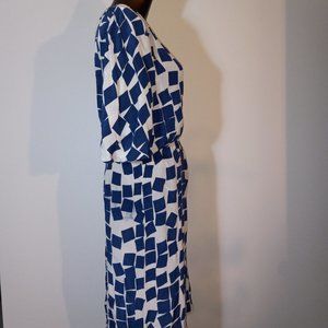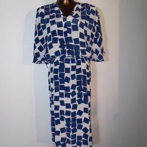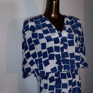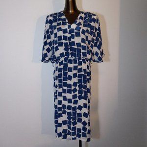 Kimono-style sleeves, v-neck, knee length dress with loose waist. Modern geometric print. Polyester crepe. Very comfortable to wear. Fits a US size 6, 8 and 10. Beautiful with drop waist or belted. Elastic waist is loose. Measures approximately 40" from nape to bottom hem.