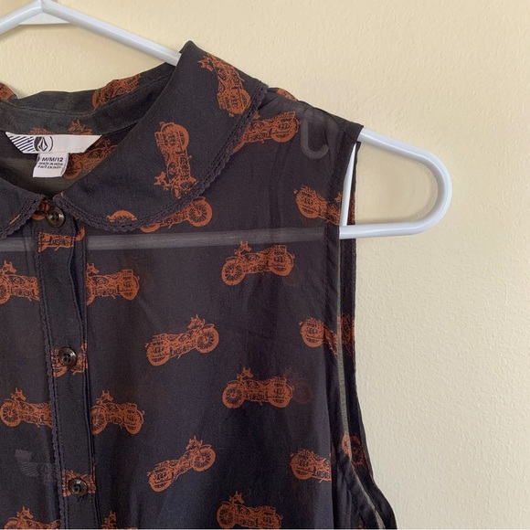 sheer black motorcycle print dress . Black slip style dress attached underneath . Cute little Peter Pan collar .. buttons down to the waist .. 100% polyester .