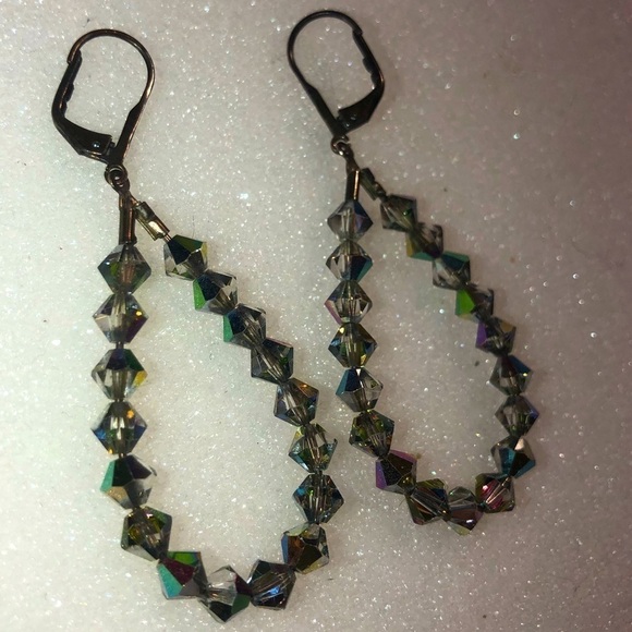 Vtg Aurora Borealis Tear Drop Pear Shape Hoop Earring Lever Back Posts 2.5”
