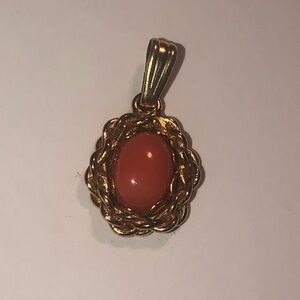 Vintage cabochon coral pendant in a 1/20 12k GF nest style setting. Approx .9” total w bale.