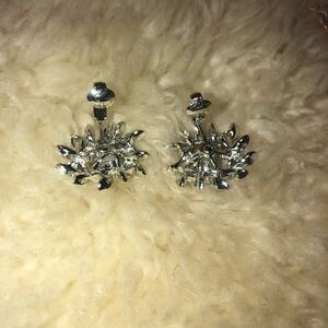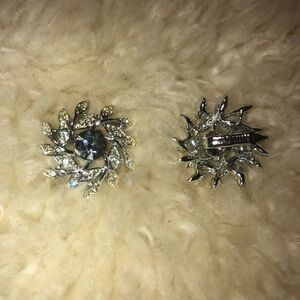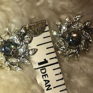 vtg Grey White Crystal Clip On Costume Earrings Floral Flower Design 1”