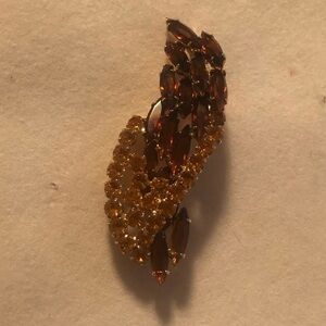 Vintage (confirmed) Juliana Delizza & Elster Gold Tone Leaf Shaped Rhinestone Brooch. Topaz Navette shape stones with orange Rivoli shaped stones. Floral type leaf design. Lovely 3d look - excellent condition. Not signed or marked - confirmed Juliana (has 3 or more Juliana characteristics)