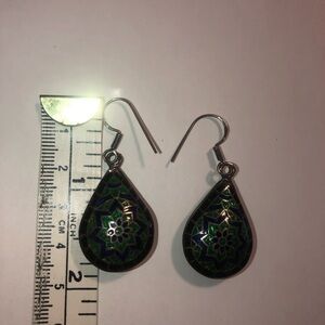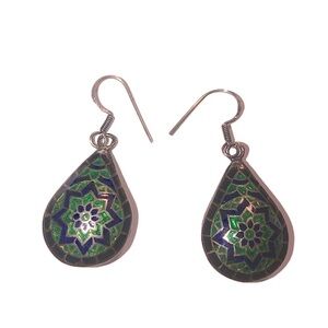 Vtg Sterling Silver Floral Cloisonne Tear Drop Pear Shaped Dangle Earrings 1.9”