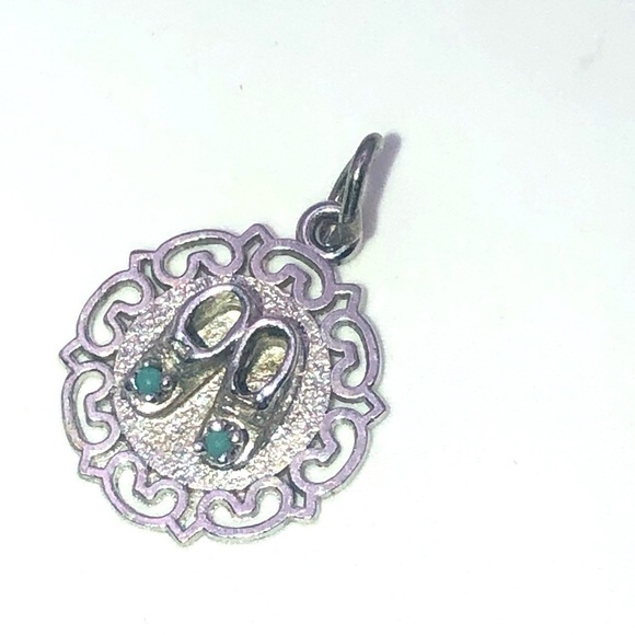 Vintage sterling silver charm bracelet charm, circle medallion with little shoes, small turquoise stone set in each shoe.