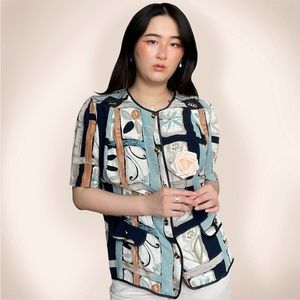 Vintage blue & white floral geometric grid short sleeve button up top w/ fancy gold rimmed buttons.
