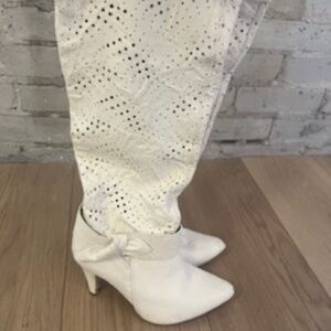Bought in Italy (Lake Como), made in Italy. White leather slouch heeled boots with detachable leather ankle belt with bow. Size 36. Very good condition. Leather slouch area has a detailed pattern with peek a boo holes through out. Super cute and very sexy boot.