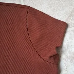 Ribbed short sleeve tee with crew neckline. Soft, stretch knit fabric. Simple, versatile silhouette for everyday wear. Easy to layer or wear solo.