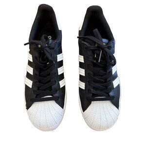 Step up your sneaker game with this rare find! Up for grabs is a pair of preowned Adidas Superstar sneaker in a striking black with classic white stripes and soles. These shoes have been worn just once, making them in excellent condition and practically new. Unfortunately, they come without the original box, but rest assured, these are a must-have for any sneaker enthusiast.