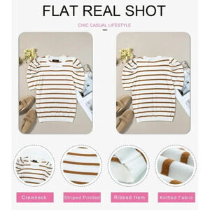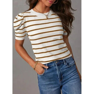 Feature: Women's summer shirts, crew neck, lantern short sleeve, knitted, color block, puff sleeve, stripe pattern, loose fit, ribbed cuff and hem, casual and lightweight design.