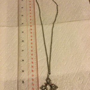 The necklace is around 20" long with a unique metal pendant. It is pre-owned, please check the pictures for details.