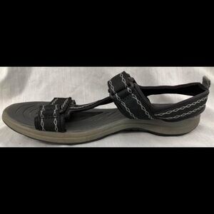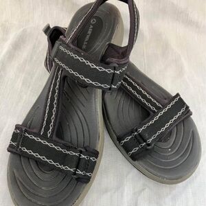 Airwalk women’s size 7 1/2 sandal, Velcro closure. Inner, outer and Velcro’s are in good used condition. Black / grey. Equates to a youth (boys / girls ) size 6, men’s size 6. Rubber sole, fabric straps with Velcro adjustable at toe and ankle for comfort and fit. Lightweight