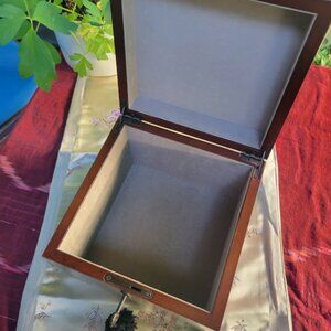 Handsome dark-wood jewelry box. Grey velvet lining, tasseled key included. Hinged lid, locks securely. Made and sold by Bombay Company. Comes from pet- and smoke-free home. Small scratches as seen in photos.