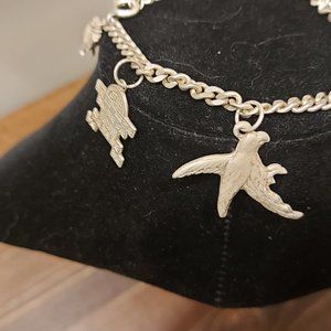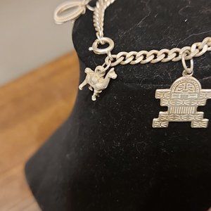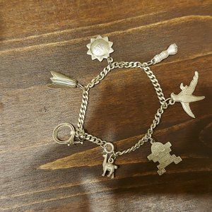 Bracelets are identical and in rough shape, heavy patina or wear patterns and scratching/scuffs are present, charms themselves are in good shape, are not broken or bent. Bracelet, unfortunately, shows the same heavy wear as the charms. Bracelet and charms are a gray color but a mystery material.