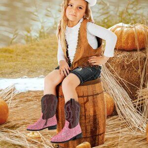xinlanlin Kids Sequins Pink Embroidered Square Toe Mid Calf Glitter Western Boot