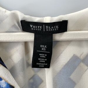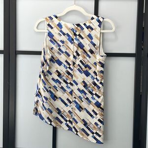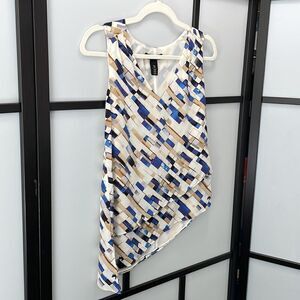 [XS] White House Black Market | Tan, White & Blue Sleeveless Asymmetrical Silk Blouse