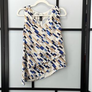 [xs] White House Black Market | Tan, White & Blue Sleeveless Asymmetrical Blouse