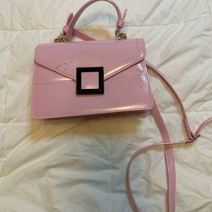 y2K barbie pink PVC purse with long adjustable strap. barbie core y2k style. snap closure and top handle.