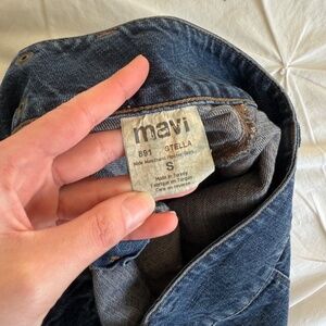 Gorgeous y2k denim low-waisted mini skirt w/ snap belt fastening, two mini front pockets, distressed bottom hemline. Medium-wash denim. Brand is mavi.