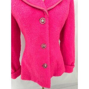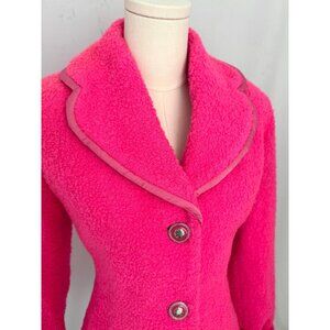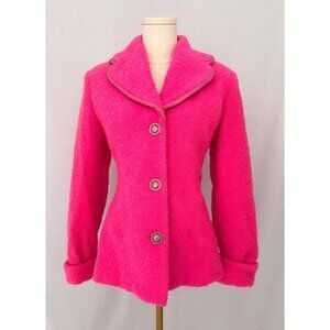 this is a gorgeous vintage coat from the early 2000s “made in Italy” by the designer Invito featuring a bright pink wool blend body – it’s perfect to wear from day to night, and is sure to make a statement! the long sleeved coat features an oversized collar, a fitted silhouette and waistline, and a front button closure with three eye-catching silver and pink buttons. the coat is made of a thick and heavy wool blend, and is lined with a silky polyester fabric. kindly note that the color of the coat appears to be more neon on the monitor than it does in real life (however it is still very bright).