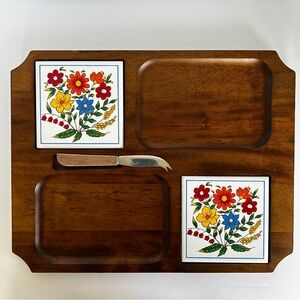 Vintage Wooden Charcuterie Cheese Board with Retro Floral Tiles