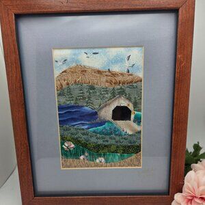 Fabric Art Covered Bridge Framed and Matted Textile Landscape Mixed Media