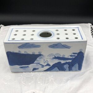 Vintage Porcelain Flower Frog Brick Blue & White Mountain Seascape Scenes Asian