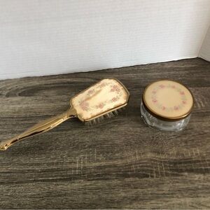 Vtg Gold Brush and Powder Jar Set with Floral Design