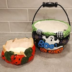 Halloween Ceramic Candy Dishes. 1 Witch's Cauldron, 1 Pumpkins.