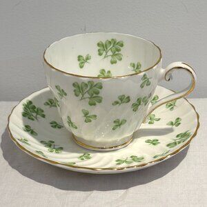 VTG Aynsley Bone China Corset Teacup And Saucer Green Rose Gold Trim