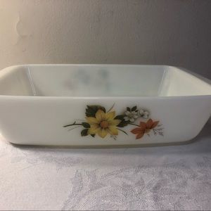 vintage JAJ Pyrex casserole dish with a lid in the Emily Spring Garden pattern.
